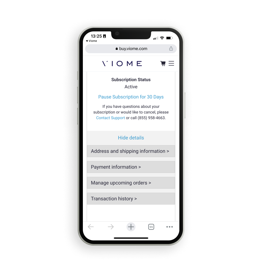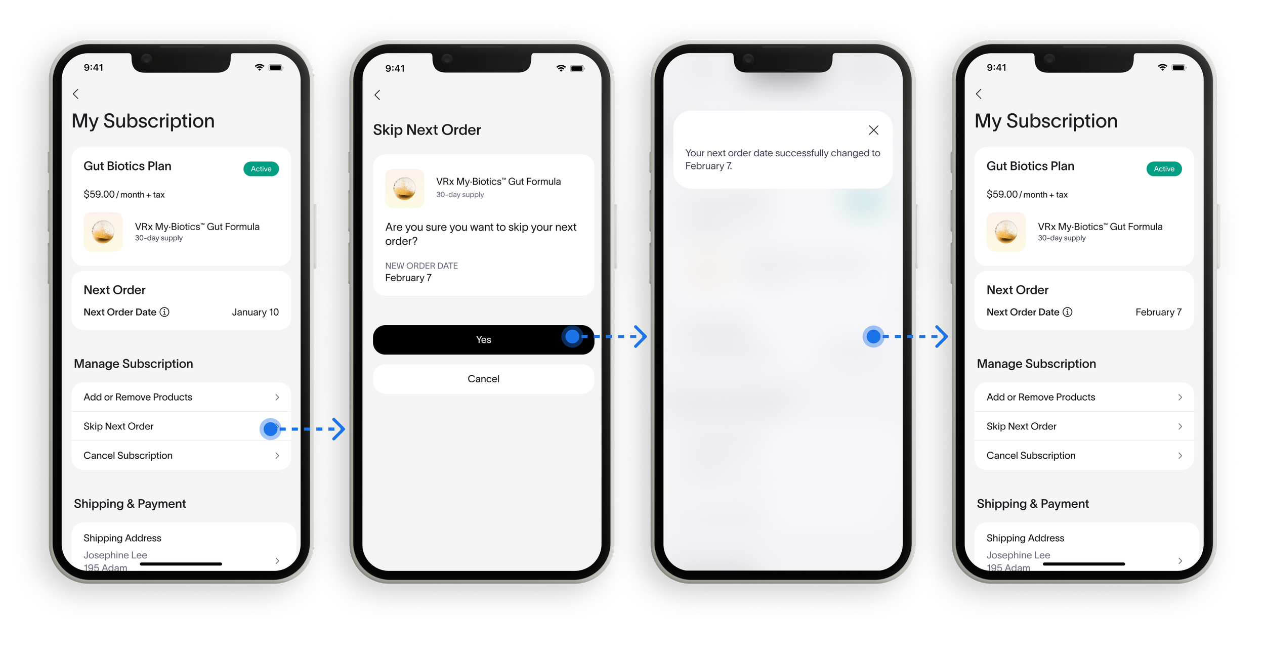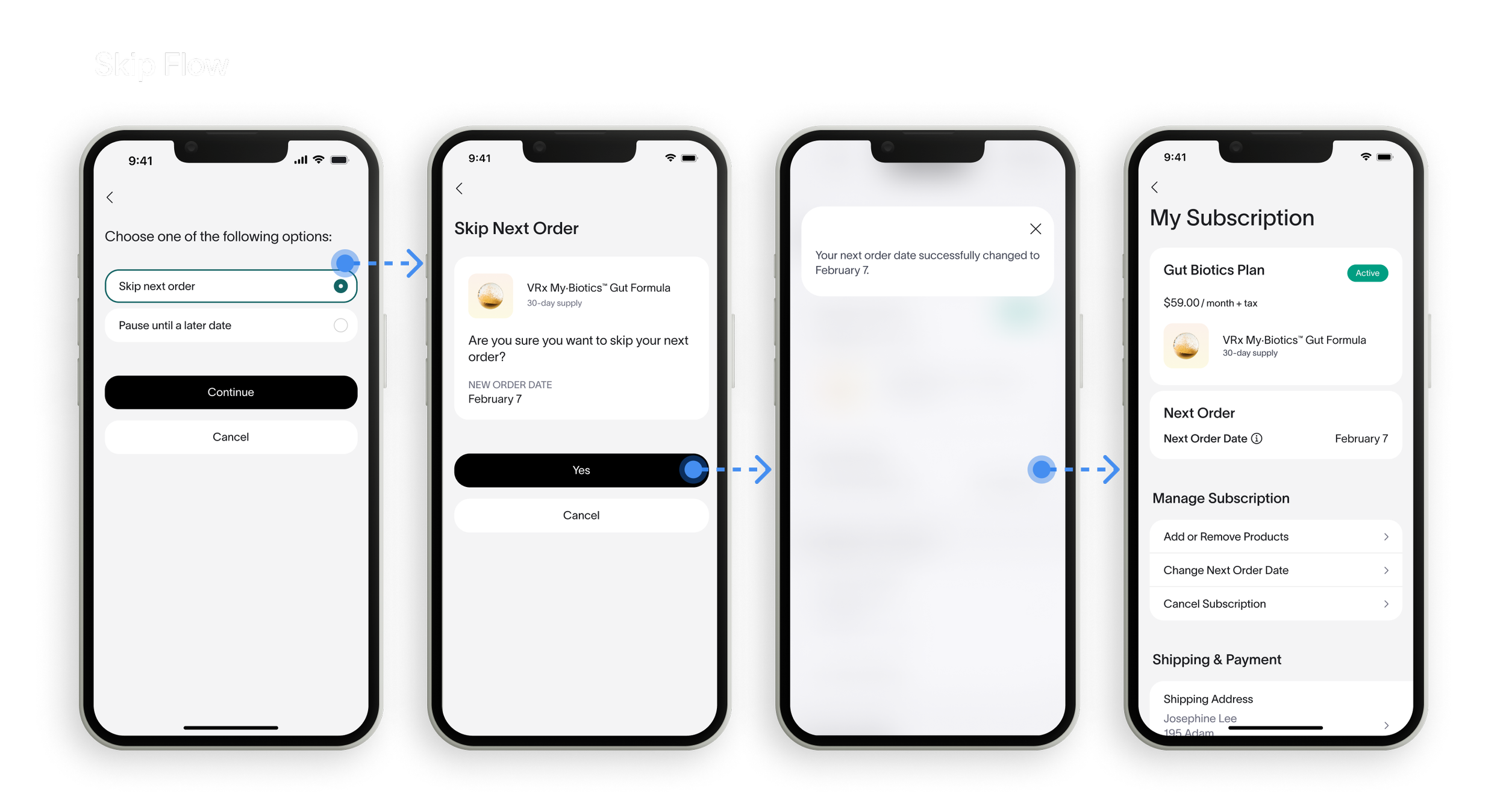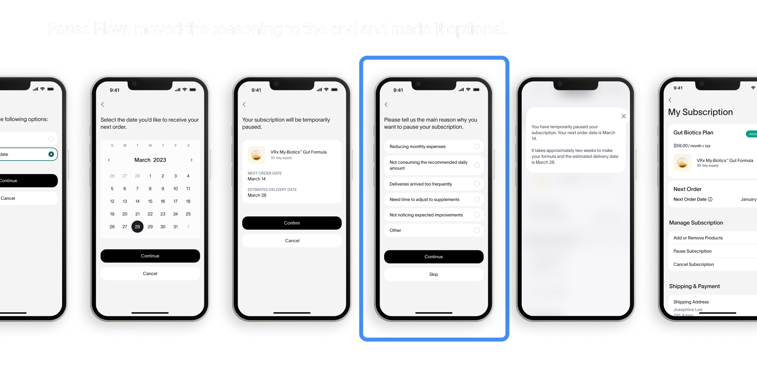 I led the design of the end-to-end subscription management experience. This enables customers to skip their next order, pause their subscription until a specific date, resume their subscription, modify the products included in their subscription, cancel their subscription, and update their shipping address or payment method. Additionally, my design accounts for various subscription plans and multiple user scenarios. For this case study, I will only showcase my design for skip next order and pause subscription flows.