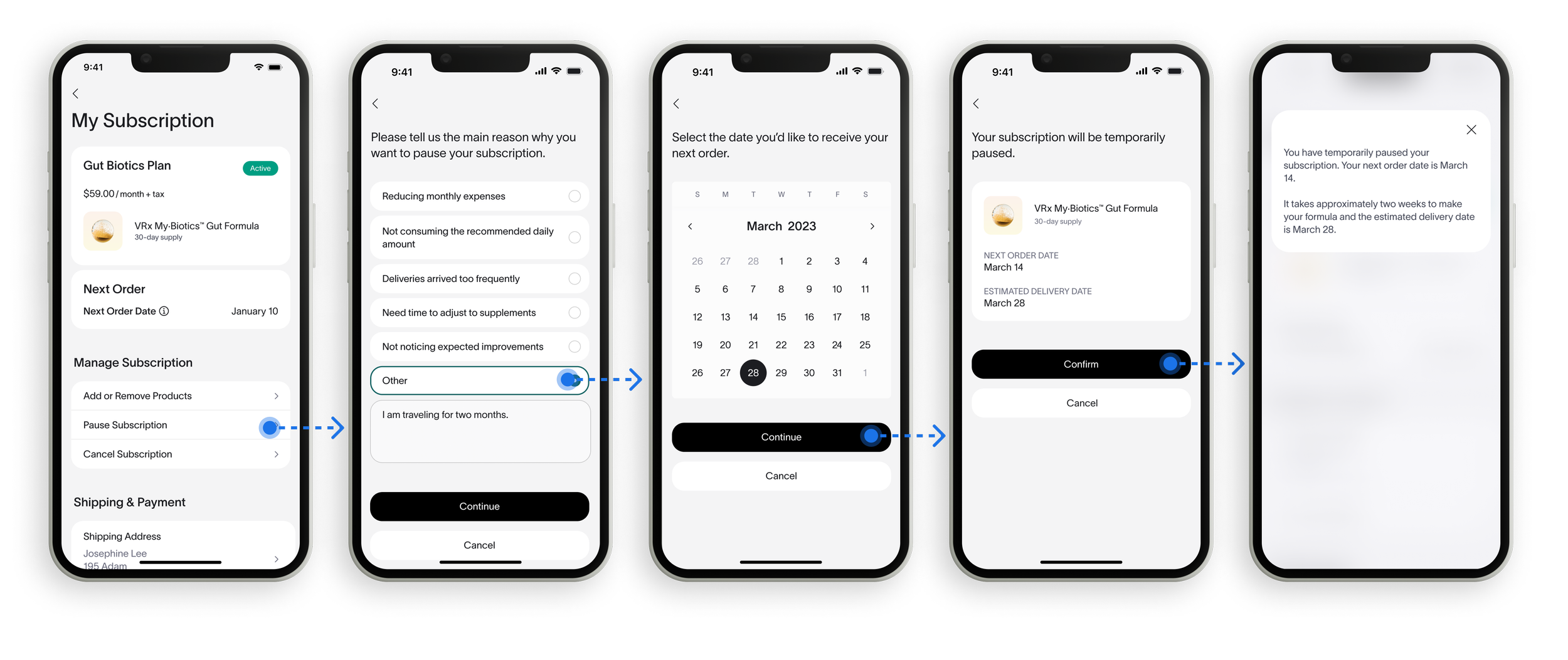 Allow customers to pause subscriptions for up to 3 months and choose next delivery date.