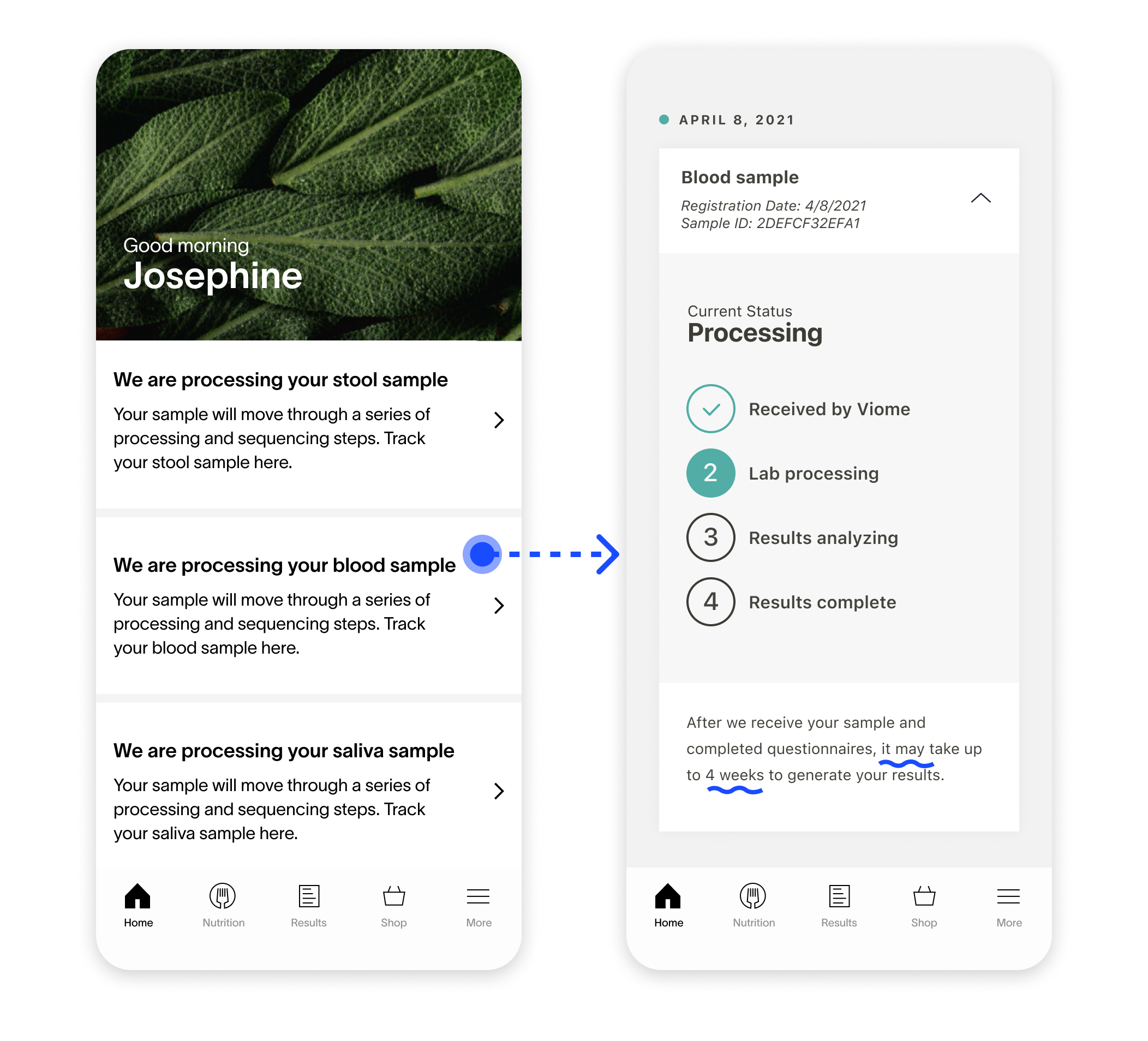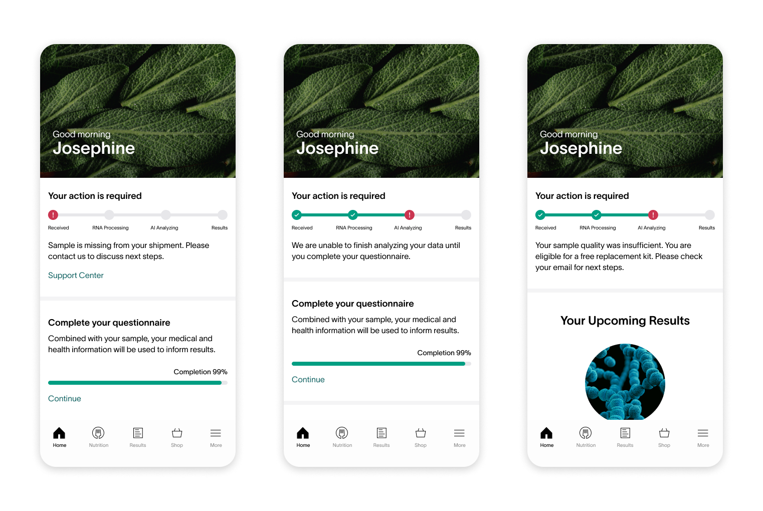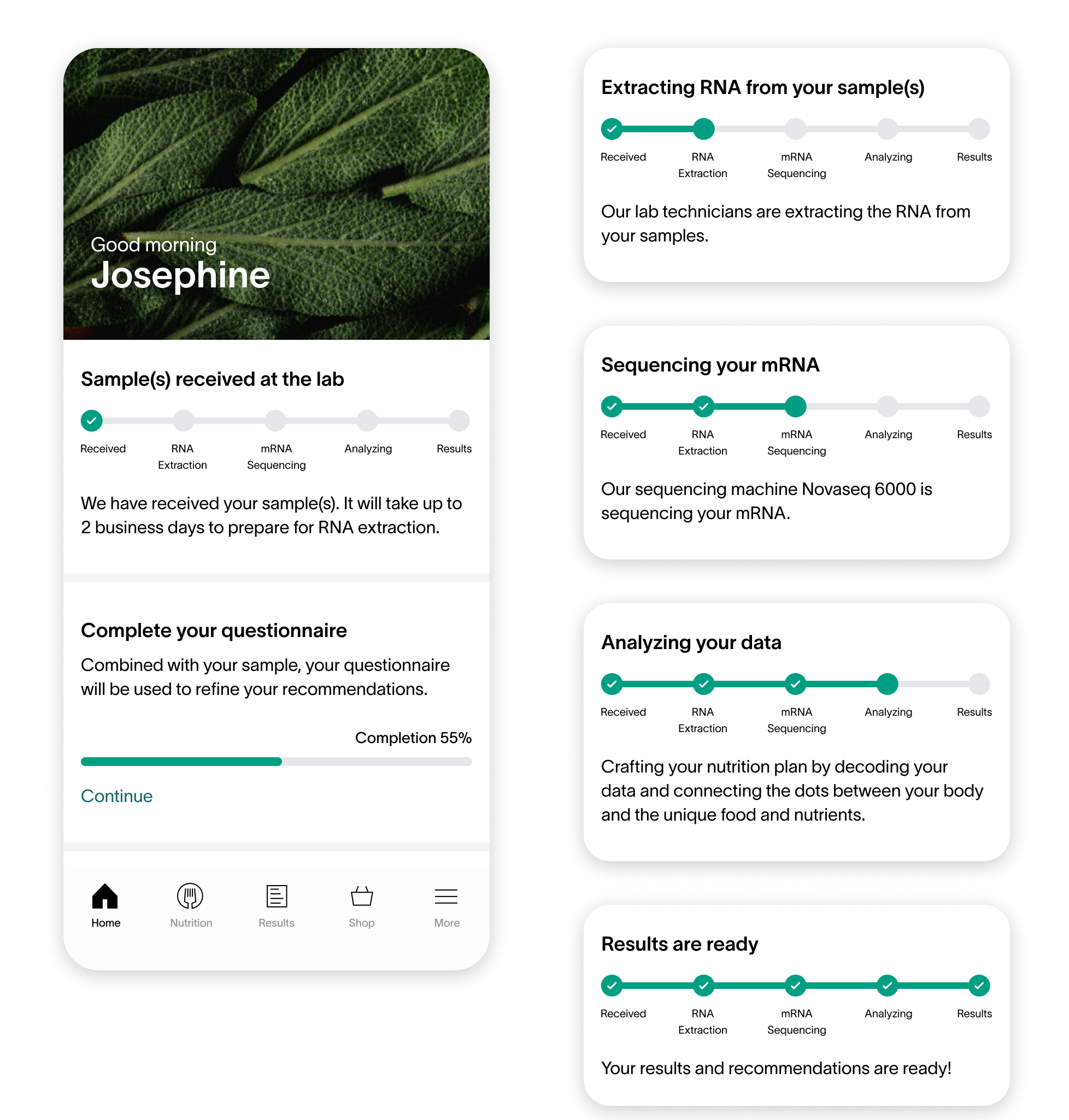 Combining the status of all samples reduces information overload. Customers only need to see one card component regarding the status of their health test results.