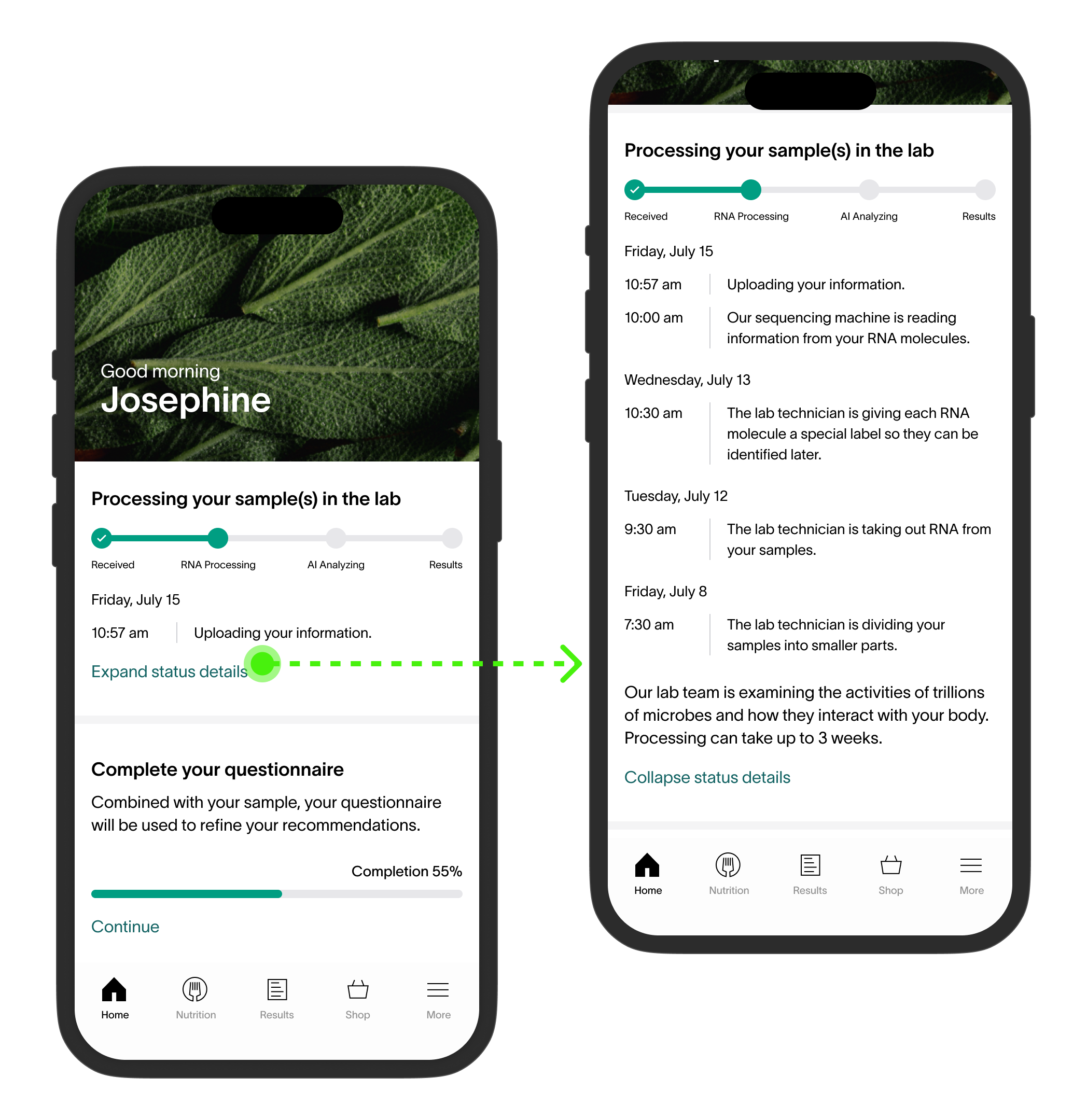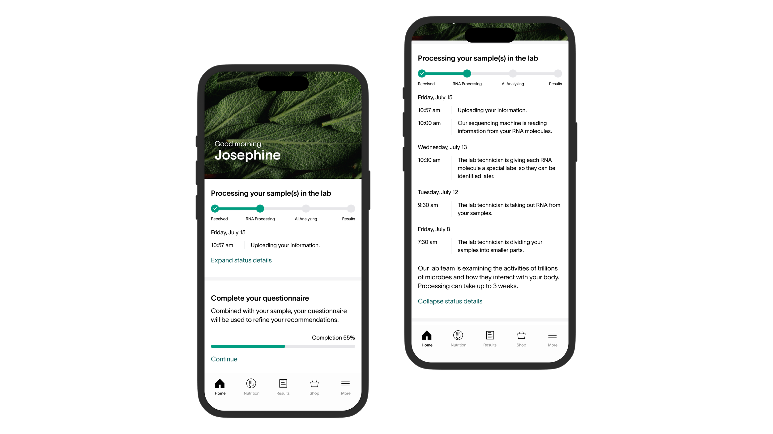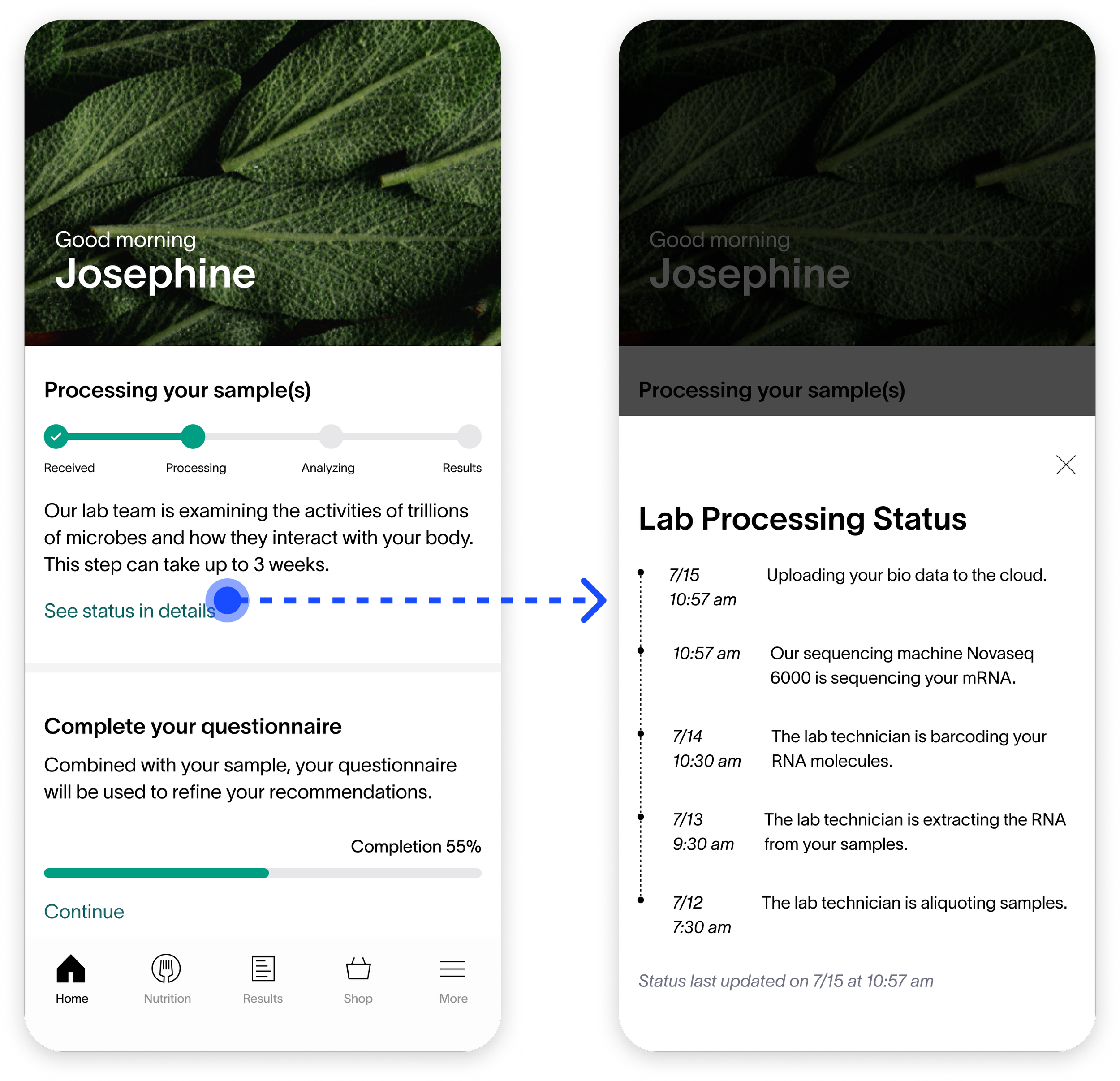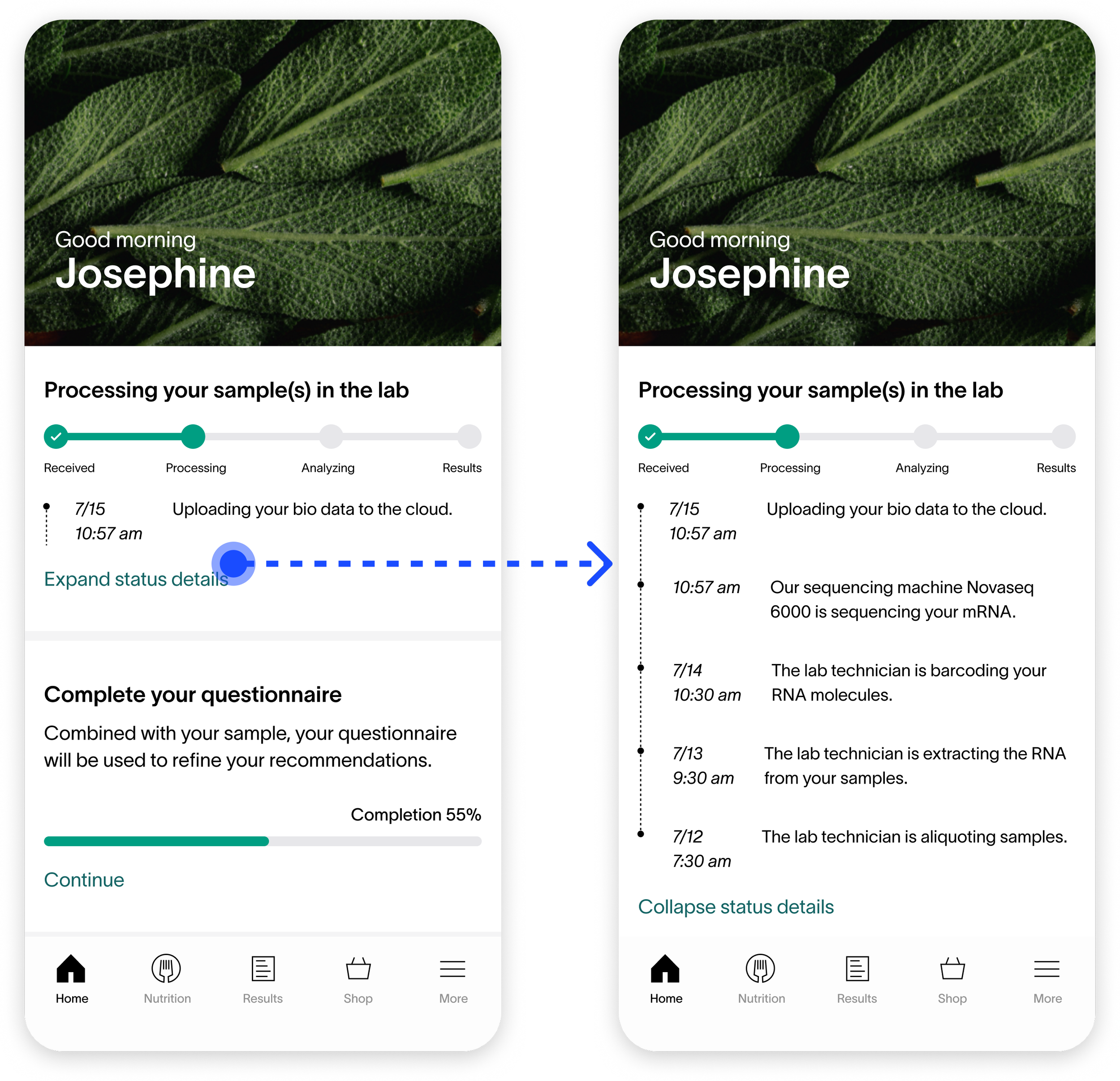 Combining the status of all samples reduces information overload. Customers only need to see one card component regarding the status of their health test results.